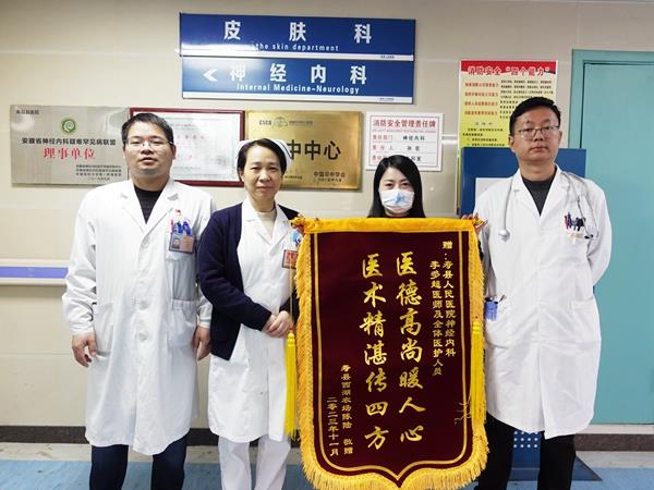 近日,寿县人民医院神经内科收到了一面锦旗:“医德高尚暖人心,医术精湛传四方”。送来锦旗的罗女士满怀感激之心来到神经内科住院病区,对医护人员在她爱人陈先生住院期间给予的精心诊疗和细致护理表示感谢。