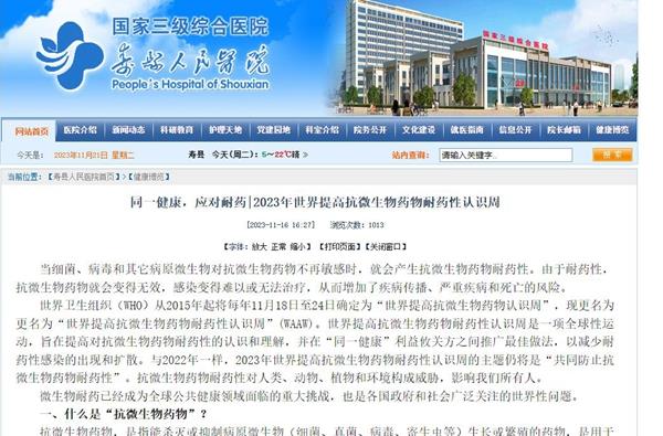 2023年11月18日至24日是今年世界提高微生物药物耐药性认识周,主题为“齐心协力,遏制耐药”。寿县人民医院积极筹备,多措并举开展系列培训及宣传活动。